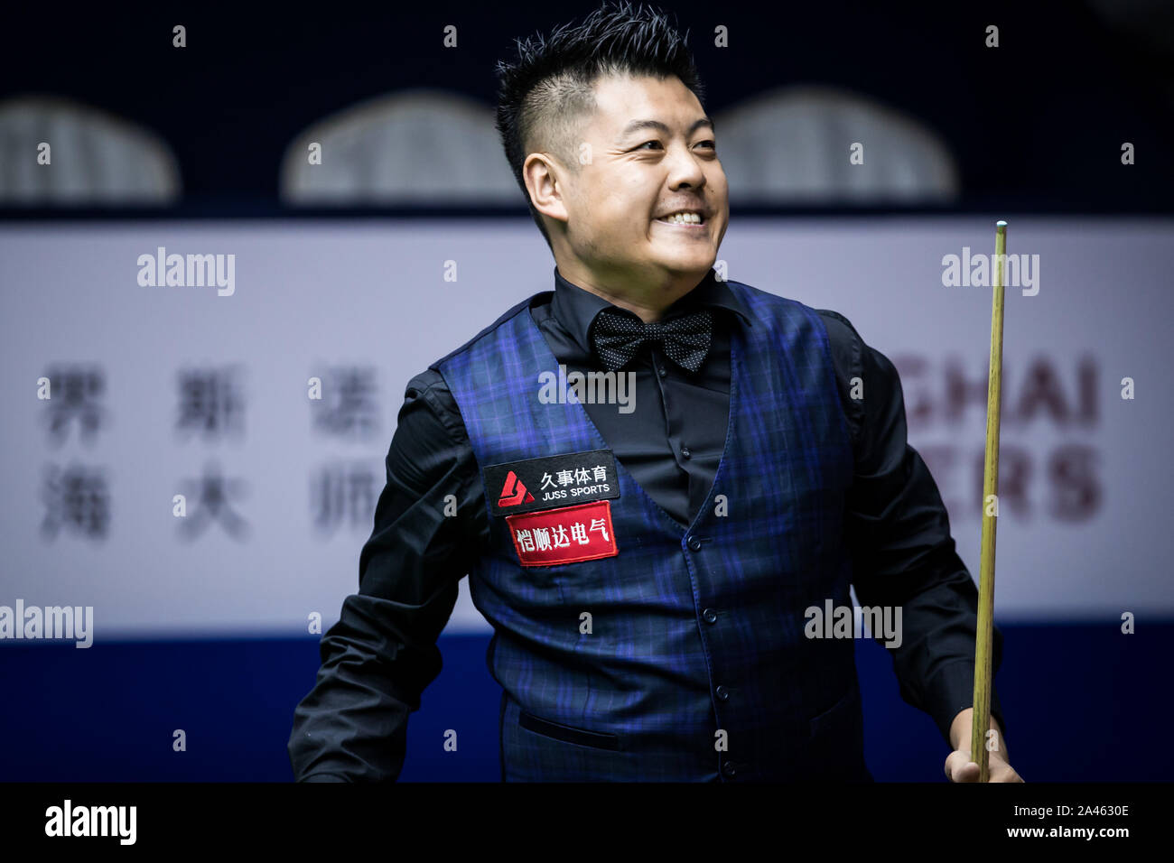 Liang Wenbo De Chine Considere Un Shot A Mark Allen De L Irlande Du Nord Lors De La Deuxieme Ronde De 2019 Snooker Masters De Shanghai A Shanghai Chine 11 Se Photo Stock